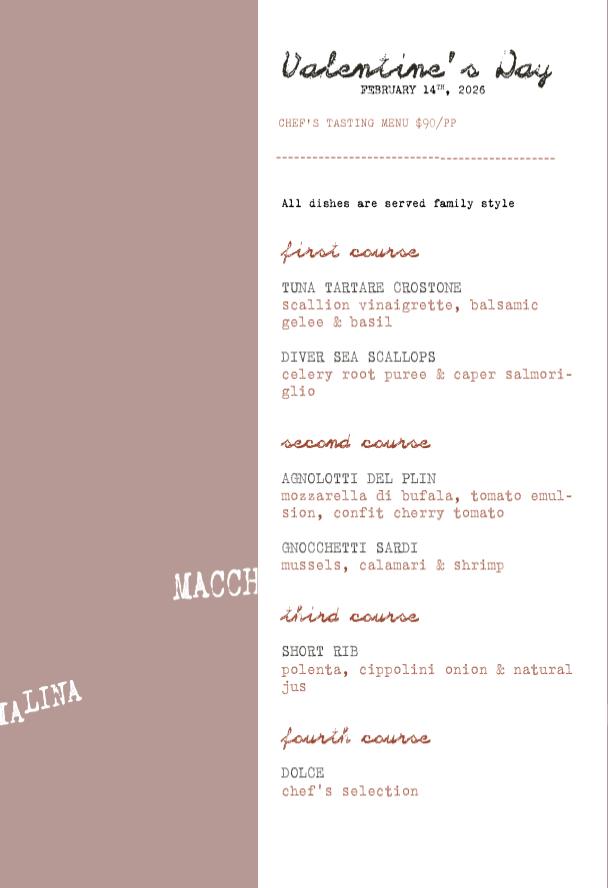 Celebrate Valentine’s Day at Macchialina with a special chef’s tasting menu served family style.